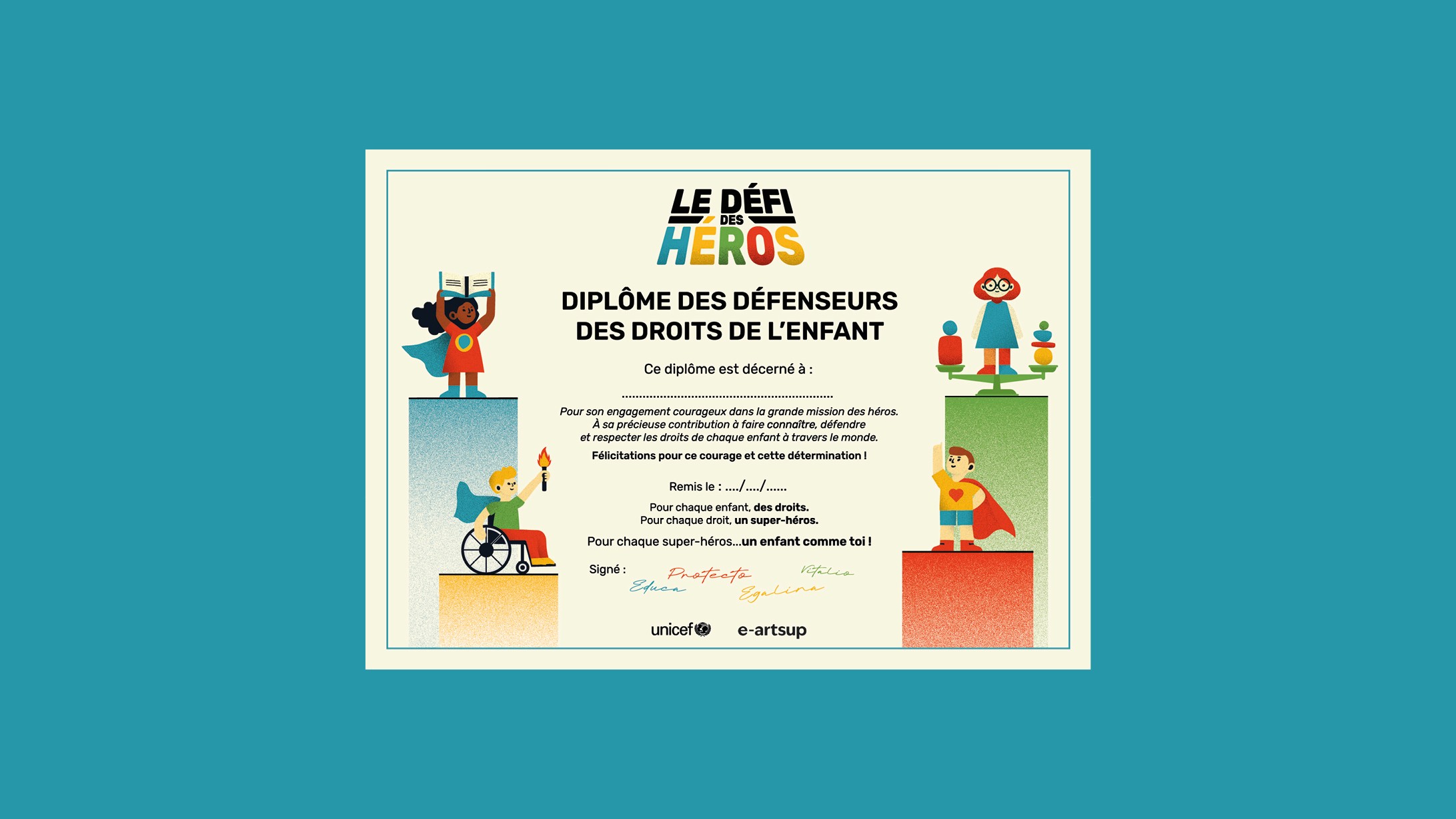 Un jeu de cartes éducatif avec des superhéros représentant les droits des enfants. Chaque carte met en avant un droit fondamental en lien avec l’UNICEF. Les super-héros illustrent des valeurs importantes à travers l’art et l’imaginaire. Le jeu est interactif et permet aux enfants de s’exprimer, d’apprendre et de réfléchir sur leurs propres droits. Au recto un visuel illustré du super-héros ainsi qu’une explication du droit qu’il défend. Au verso une “question”, un “fun fact”, un “le saviez-vous ?” ou un “vrai/faux” en rapport avec les droits des enfants et l’art. Sur certaines cartes une illustration dans le style de notre jeu pour illustrer le propos de la carte.